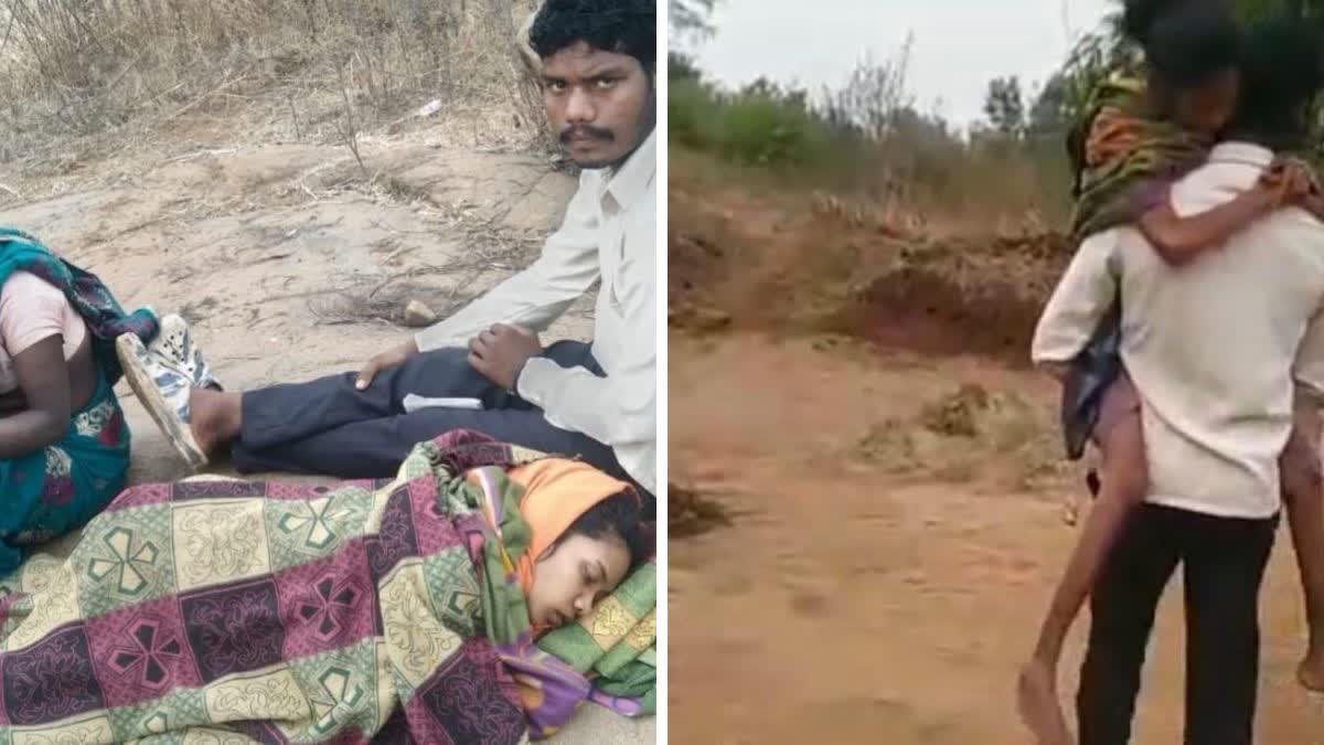 कंधे पर लादकर गर्ववती पत्नी को पहुंचाया: गांव वालों का कहना है कि यहां सड़क नहीं होने के चलते अक्सर इस तरह की तस्वीरें देखने को मिलते रहती है. गांव वालों का कहना है कि रात के वक्त अगर किसी की तबीयत बिगड़ जाए तो बड़ी मुश्किल होती है. कई बात तो मरीजों को खाट पर लादकर भी अस्पताल तक और एंबुलेंस तक लाया गया है. गांव वालों का कहना है कि कई बार जिम्मेदार अफसरों और जनप्रतिनिधियों से रोड की मांग की गई. किसी भी अधिकारी या नेता ने उनकी मांगों पर ध्यान नहीं दिया.