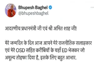 मनीष बंछोर, आशीष वर्मा के भिलाई तीन और विजय भाटिया के नेहरू नगर ईस्ट स्थित मकान में सुबह से टीम दस्तावेजों की जांच कर रही है। कार्रवाई पर सीएम भूपेश ने ट्वीट कर निशाना साधा है। उन्होंने लिखा है कि प्रधानमंत्री जी और अमित शाह जी मेरे जन्मदिन के दिन आज मेरे राजनीतिक सलाहकार और मेरे ओएसडी सहित करीबियों के घर ईडी भेजकर मुझे तोहफा दिया है उसके लिए बहुत आभार।