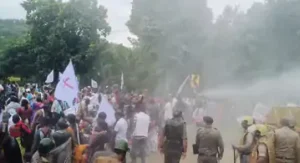 पुलिस ने प्रदर्शनकारियों को रोकने के लिए वाटर कैनन का इस्तेमाल किया।