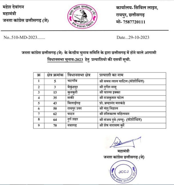 जनता कांग्रेस छत्तीसगढ़ (जे) ने घोषित किए 9 प्रत्याशी