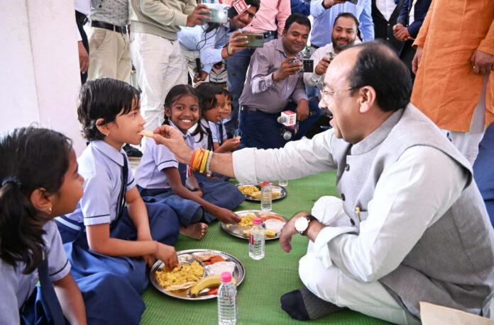 गौरेला-पेंड्रा-मरवाही-उप मुख्यमंत्री अरुण साव तथा स्वास्थ्य मंत्री एवं गौरेला-पेंड्रा-मरवाही जिले के प्रभारी मंत्री श्याम बिहारी जायसवाल आज पेंड्रा में स्कूली बच्चों के न्योता भोज में शामिल हुए। उन्होंने बड़े स्नेह से बच्चों को भोजन परोसा और उनके साथ जमीन पर बैठकर खाना खाया। प्रधानमंत्री पोषण शक्ति योजना के तहत स्वामी आत्मानंद उत्कृष्ट अंग्रेजी माध्यम विद्यालय पेण्ड्रा में गौरेला-पेंड्रा-मरवाही जिला प्रशासन द्वारा आयोजित न्योता भोज में उप मुख्यमंत्री अरुण साव, स्वास्थ्य मंत्री श्याम बिहारी जायसवाल,विधायक धरमलाल कौशिकप्रणव कुमार मरपच्ची और श्री किरण सिंह देव ने बच्चों को खीर, पूड़ी, पुलाव, पापड़, सलाद, चटनी और केला परोसा। उन्होने नन्हें बच्चों को अपने हाथों से खाना खिलाया और उनके साथ लाइन में बैठकर भोजन किया। उप मुख्यमंत्री, स्वास्थ्य मंत्री और विधायकों के साथ जनप्रतिनिधियों ने बच्चों के साथ पौष्टिक और स्वादिष्ट न्योता भोज किया।