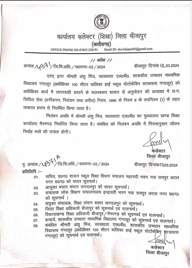 बीजापुर। गंगालूर 100 सीटर बालिका पोटाकेबिन छात्रावास के कक्षा 12 वीं में अध्ययनरत एक छात्रा ने पेट में दर्द होने की शिकायत के बाद उसे गंगालूर अस्पताल में भर्ती करवाया गया, जहां छात्रा ने अस्पताल में एक बच्चे को जन्म दिया है। इस खबर के बाद पूरे जिले में हड़कंप मच गया है। इसकी पुष्टि जिला शिक्षा अधिकारी बीआर बघेल ने भी की है। पुलिस और शिक्षा विभाग के अधिकारी सहित प्रशासनिक अधिकारियों का गंगालूर अस्पताल में जमावाड़ा लग गया है, मामले की जांच शुरू कर दी गई है। इस मामले में छात्रावास अधीक्षिका अंशु मिंज को बीजापुर कलेक्टर ने तत्काल निलंबित कर दिया है।