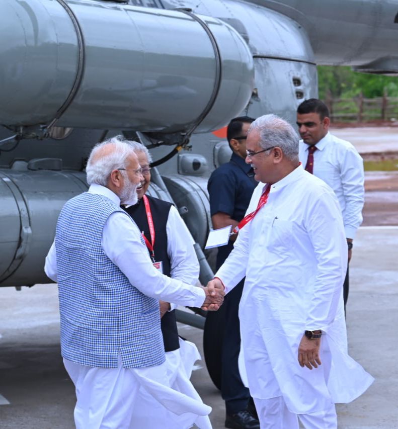 रायपुर- प्रधानमंत्री नरेंद्र मोदी के आज सुबह राजधानी रायपुर पहुंचने पर पंडित रविशंकर शुक्ल हेलीपेड पर मुख्यमंत्री भूपेश बघेल ने उनकी अगवानी की। उन्होंने प्रधानमंत्री को पुष्प गुच्छ भेंट कर उनका छत्तीसगढ़ में आत्मीय स्वागत किया।इस मौके पर मुख्यमंत्री भूपेश बघेल ने प्रधानमंत्री जी को स्मृति चिन्ह के रूप छत्तीसगढ़ के कारीगरों द्वारा तैयार अंगवस्त्र और मिलेट्स की टोकरी भेंट की.