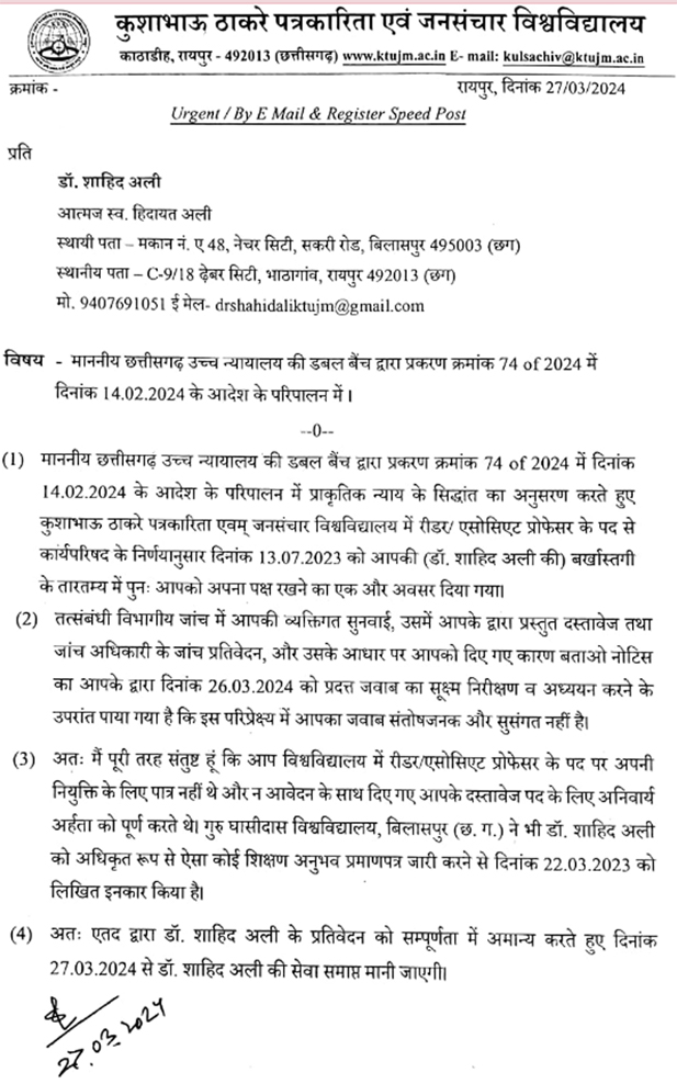 रायपुर। कुशाभाऊ ठाकरे पत्रकारिता विवि के एसोसिएट प्रोफेसर डा.शाहिद अली की सेवाएं समाप्त कर दी गई है। काफी समय से उनकी नियुक्ति व डिग्री को लेकर विवाद चल रहा था। फर्जी दस्तावेजों के आधार पर नौकरी पाना बताया गया था। कुलपति बलदेव भाई शर्मा के निर्देश पर 27 मार्च को आदेश जारी किया गया था। आदेश तिथि से ही सेवाएं समाप्त मानी जायेगी। विवि प्रबंधन ने अली के दोनों ही पतों पर आदेश भेज दिया है।