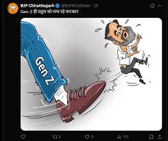 रायपुर-छत्तीसगढ़ की सियासत में इन दिनों सोशल मीडिया पर कार्टून वॉर चल रहा है। बीजेपी ने दो कार्टून जारी किया है। पहले कार्टून पोस्टर में दो करेक्टर्स है, जिसमें जेन- Z से राहुल गांधी को लात मारते दिखाया गया है।