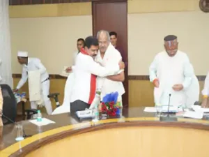 डिप्टी सीएम विजय शर्मा ने बृजमोहन अग्रवाल को गले लगाया।
