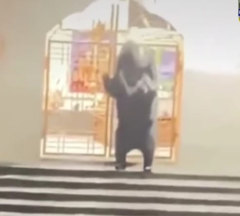 वीडियो में साफ तौर पर देखा जा साकता है की खूंखार एक एक भालू शिव मंदिर में पहुंचाहै और दो पैरों पर खड़े होकर भगवान को प्रणाम कर रहा है जिसे ग्रामीणों ने अपने मोबाइल कैमरे में कैद कर लिया .जो अब सोशल मीडिया पर वायरल हो रहा है. यह मामला दसपुर गांव का है। वीडियो में देखा जा सकता है कि भालू पंडाल में पहुंचकर पहले भगवान को प्रणाम कर रहा है फिर दो पैरों पर खड़ा होकर हाथ जोड़ रहा है जिसे देख ग्रामीणों ने जयकारा लगाएं और कमरे में कैद कर लिया .एक ग्रामीण ने बताया कि भालू ने भगवान को प्रणाम करने के बाद प्रसाद भी ग्रहण किया।।