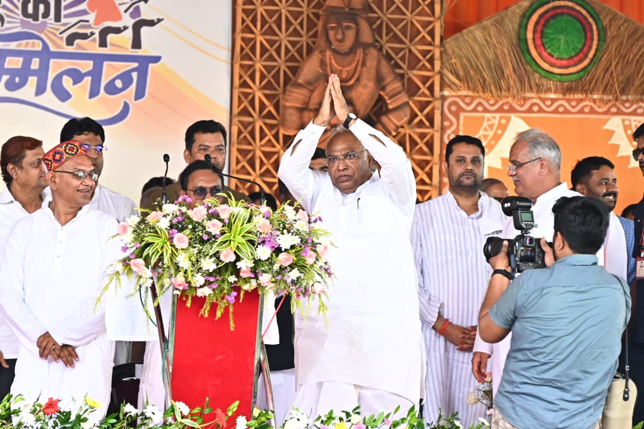 रायपुर। भरोसे का सम्मेलन को संबोधित करते हुए नेता प्रतिपक्ष श्री मल्लिकार्जुन खडग़े ने अपने सम्बोधन की शुरुआत जय जोहार से किया। इस दौरान उन्होंने राजनांदगांव जिले के पुरोधाओं का स्मरण किया। इसके साथ ही गुरु घासीदास, शहीद वीरनारायण सिंह को भी नमन किया।