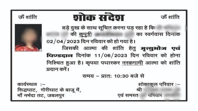 युवती के परिवार वालों ने बताया कि अपनी बेटी को मृत मान लिया है। इसलिए उसका पिंडदान और मृत्युभोज का आयोजन किया जाएगा। इस संबंध में शोक संदेश भी छपवाया गया है, जो सोशल मीडिया में तेजी से वायरल हो रहा है। परिवार वालों ने इस कार्ड में बेटी को कुपुत्री बताया है और नरकगामी आत्मा की शांति के लिए पिंडदान आयोजित किया है। जानकारी है कि युवती के निकाह के बाद से ही उसके पिता का स्वास्थ खराब हो गया है।