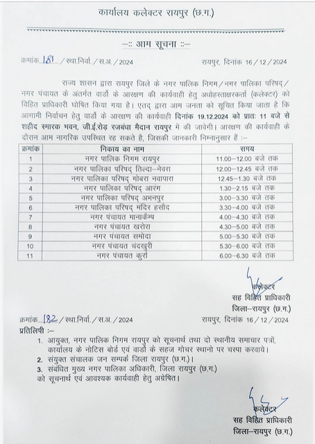 Homeछत्तीसगढ़रायपुर नगर निगम के 70 वार्डों का आरक्षण 19 दिसंबर को छत्तीसगढ़ रायपुर नगर निगम के 70 वार्डों का आरक्षण 19 दिसंबर को By वीसीएन टाइम्स December 17, 2024 Share FacebookTwitterPinterestWhatsApp रायपुर। रायपुर नगर निगम के सभी 70 वार्डों का आरक्षण 19 दिसंबर को शहीद स्मारक भवन में सुबह 11 बजे से शुरू होगा। न सिर्फ रायपुर नगर निगम बल्कि जिले के अन्य निकायों का भी आरक्षण होगा। Share FacebookTwitterPinterestWhatsApp Previous articleभर गया महाकाल का खजाना…. 1 साल में 112 करोड़ रुपए से अधिक की आयNext articleकृषि भूमि की अवैध प्लाटिंग पर सख्त रुख, नए नियमों का होंगे लागू वीसीएन टाइम्सhttps://vcntimes.com RELATED ARTICLES छत्तीसगढ़ सुपर फास्ट:छत्तीसगढ़ के साथ देश की 10 बड़ी खबरे March 13, 2026 छत्तीसगढ़ इन 5 राशि वालों के लिए दिन रहेगा खास, नौकरी-व्यापार में मिलेगी खुशखबरी March 13, 2026 छत्तीसगढ़ रमजान का आखिरी जुमा:नेवरा जामा मस्जिद में उमड़ी अकीदतमंदों की भीड़, अदा की गई नमाज. March 13, 2026 LEAVE A REPLY Cancel reply Comment: Please enter your comment! Name:* Please enter your name here Email:* You have entered an incorrect email address! Please enter your email address here Website: Save my name, email, and website in this browser for the next time I comment. Most Popular Unlock the Gateway to Thrilling Wins with Barz Casino Access March 13, 2026 Desvendando o Poder Oculto do Bloco da Sorte Secreto March 13, 2026 Plongée fascinante dans l’univers des avis sur Lucky Block March 13, 2026 Unlock Unforgettable Wins with Yako Casino Bonus Magic March 13, 2026 Load more Recent Comments निशा on कल से 15 दिनों तक नहीं खुलेंगे शराब की दुकानें.. मांस-मटन भी नही मिलेगा