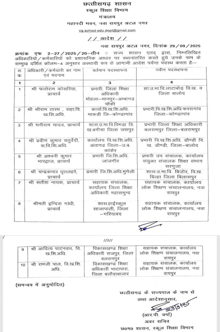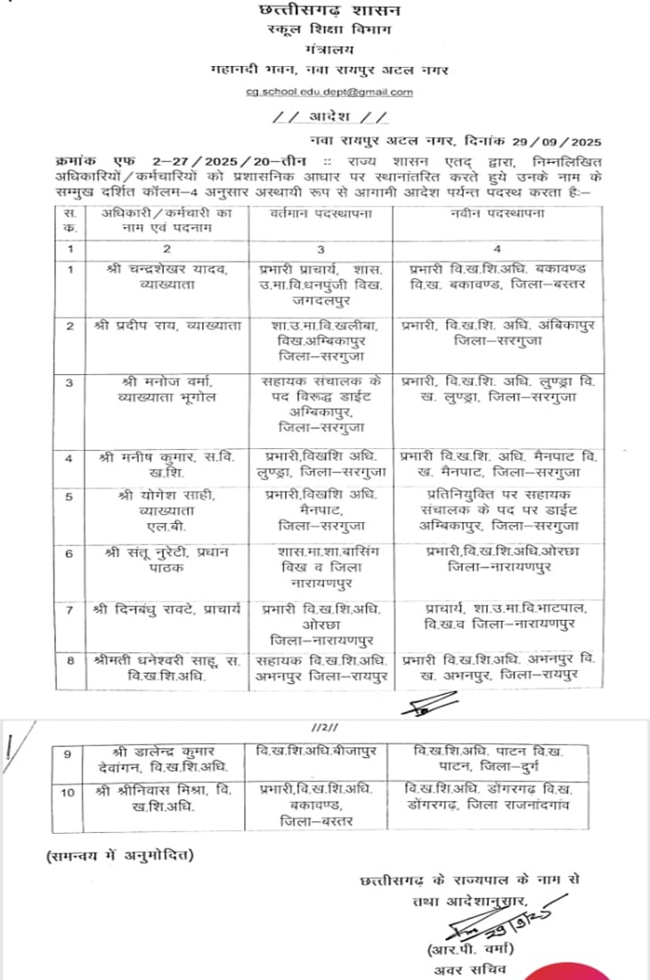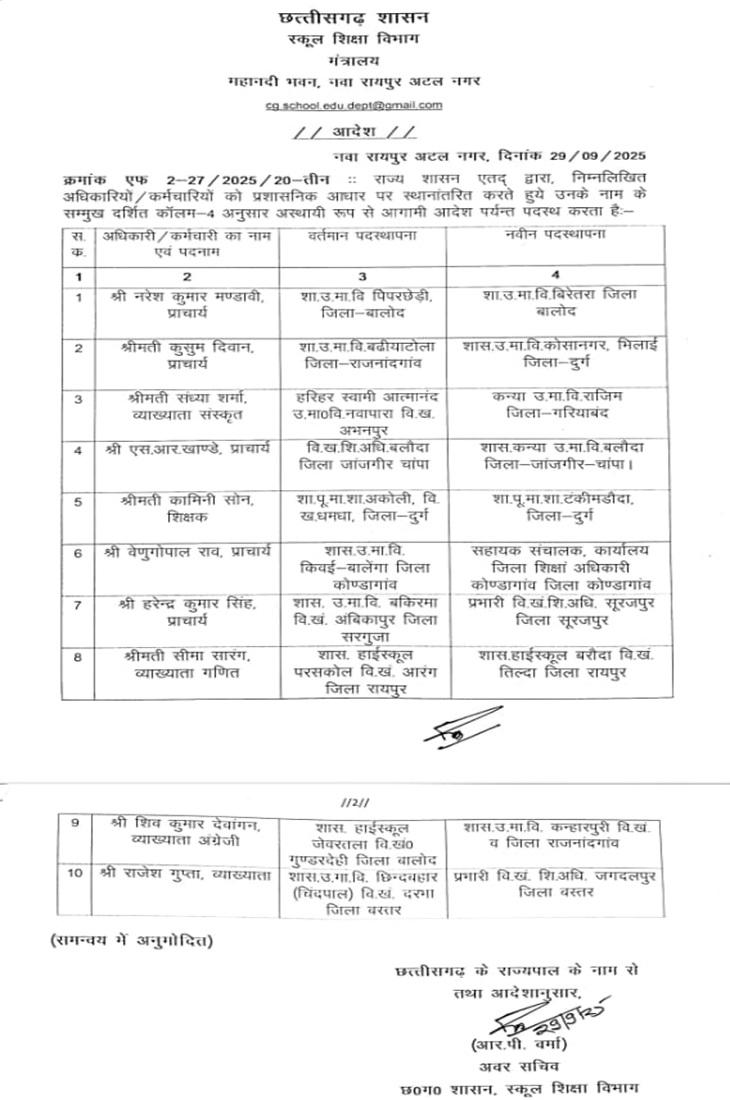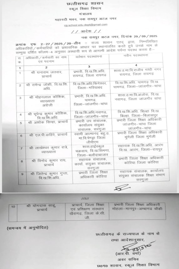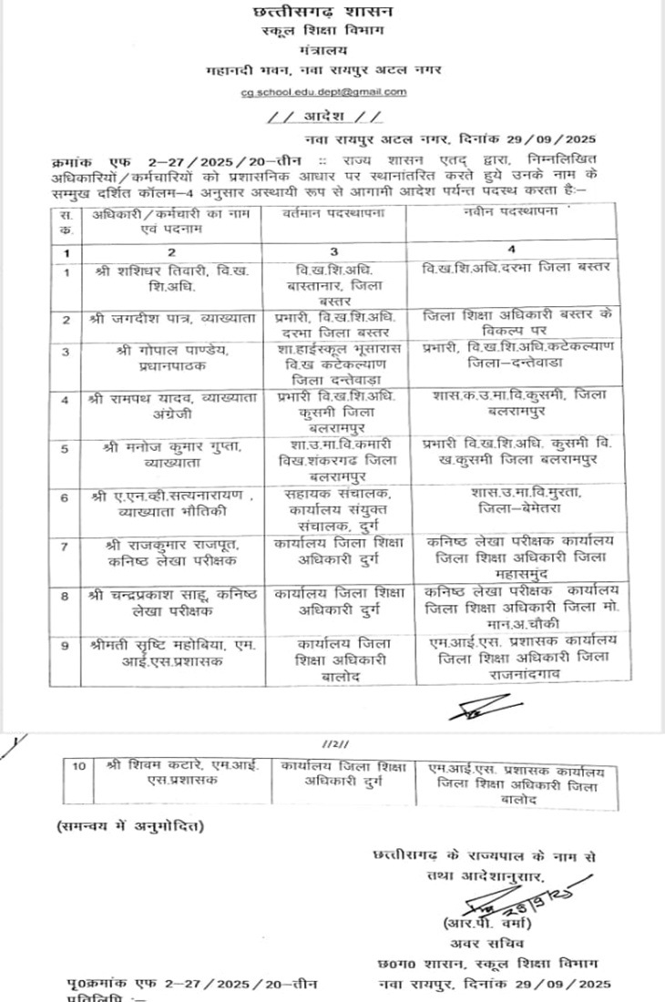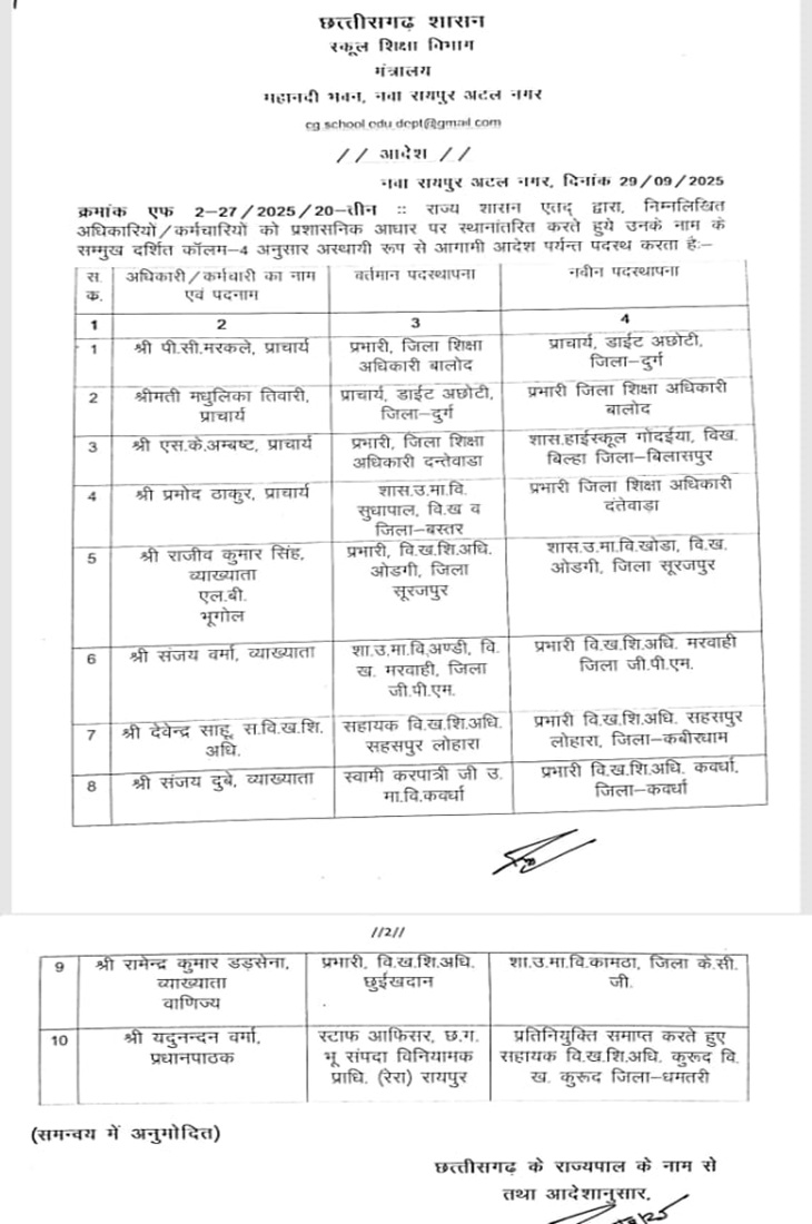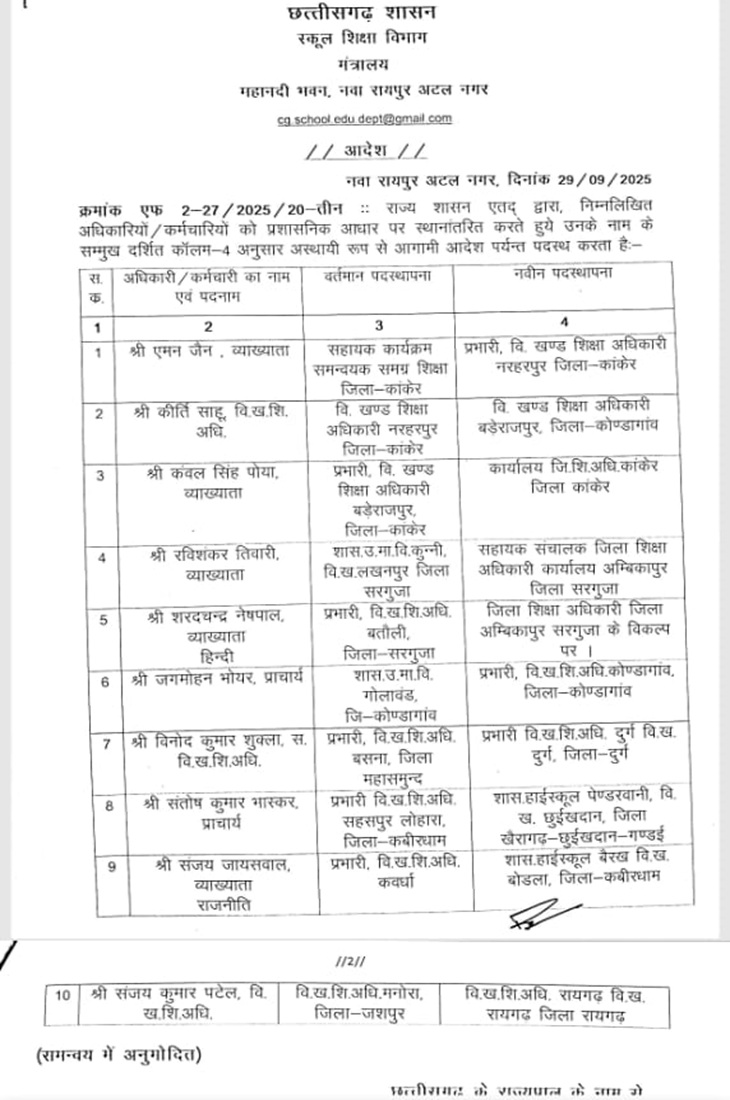 रायपुर -स्कूल शिक्षा मंत्रालय ने थोक में तबादलों की सूची सोमवार को जारी की है। इसमें कई DEO एवं BEO बदले गए हैं। चार दिनों में शिक्षा विभाग की यह दूसरी सूची है। इसके पहले शिक्षकों की प्रतिनियुक्ति का आदेश जारी किया गया था, जिसमें कई जिलों के डीएमसी बदले गए थे एवं शिक्षकों की प्रतिनियुक्ति समाप्त की गई थी एवं ली गई थी। शिक्षकों के तबादले की अनुशंसा सूची आदेश के पहले ही वायरल हो गई थी। तबादला सूची में वायरल सूची के लगभग सभी नाम शामिल हैं।