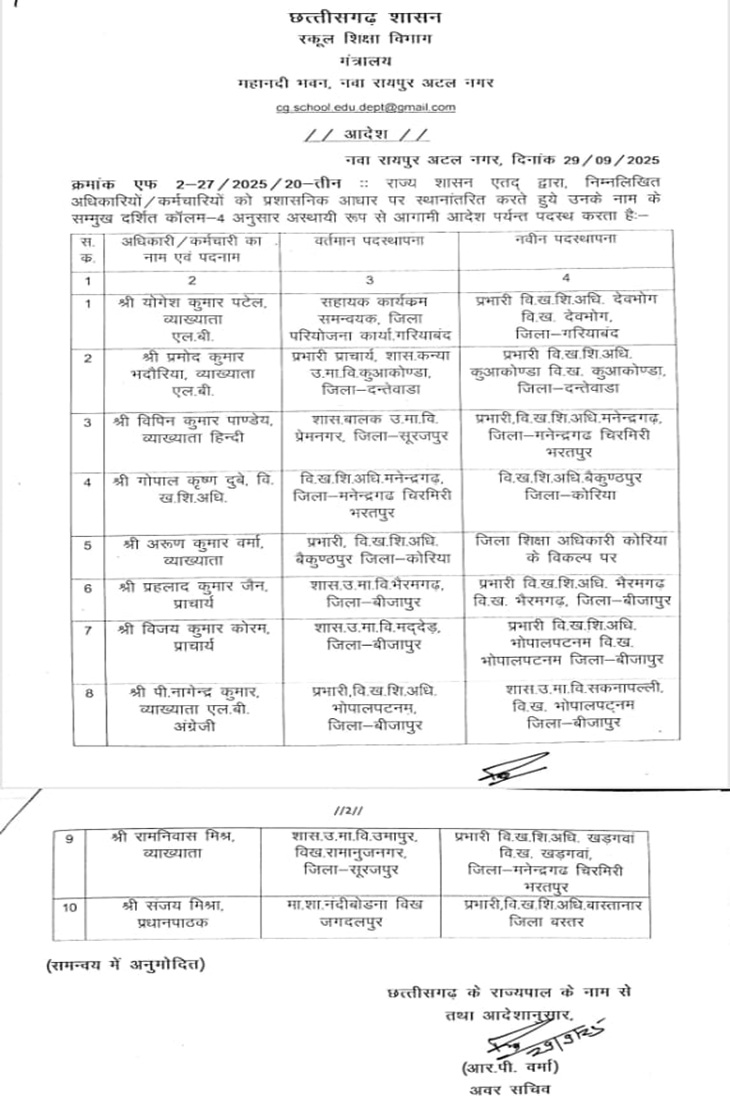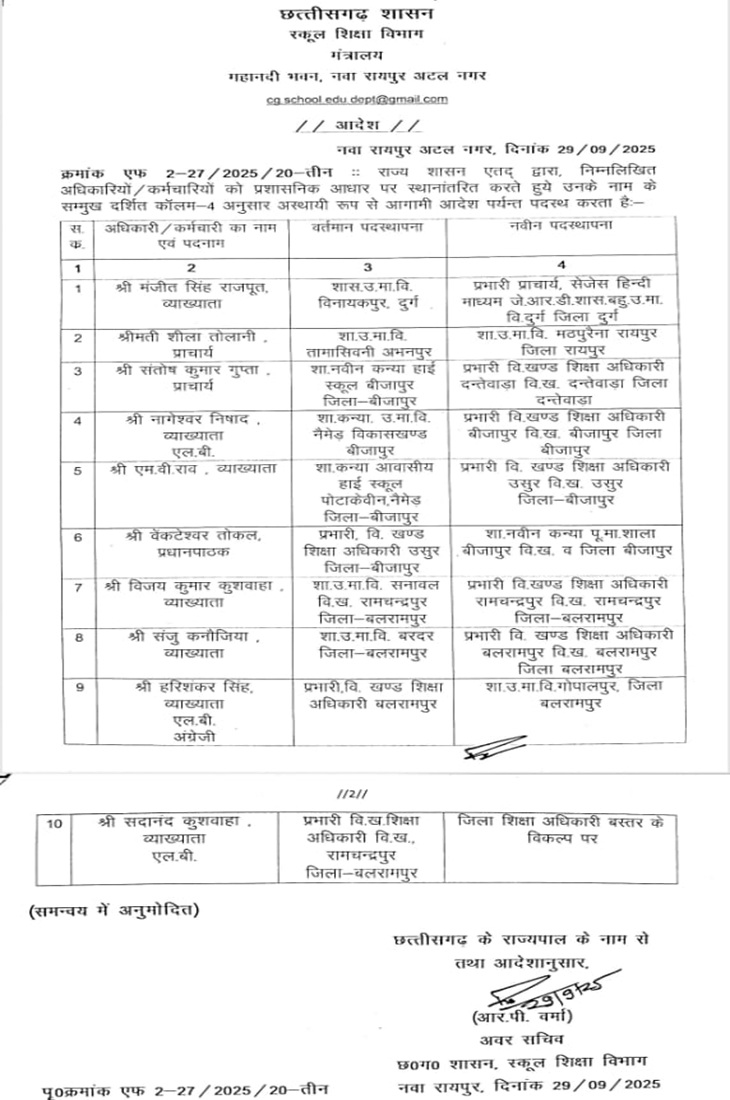 फिर से लेक्चररों को BEO का प्रभार छत्तीसगढ़ में गजेंद्र यादव को शिक्षा मंत्री बनाए जाने के बाद यह तबादलों व पदस्थापना की दूसरी सूची है। मुख्यमंत्री के पास शिक्षा मंत्रालय का प्रभार रहने के दौरान लेक्चररों को BEO का प्रभार नहीं दिया जा रहा था। इस पर अघोषित रोक थी। हालांकि पहले से प्रभार में रहे BEO को नहीं हटाया गया था। नई सूची में अधिकांश स्थानों पर BEO का प्रभार लेक्चरर को दिया गया है। कुछ स्थानों पर प्राचार्य भी प्रभारी BEO बनाए गए हैं।