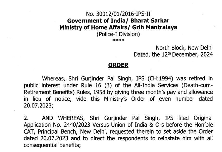 केंद्रीय गृह मंत्रालय ने 12 दिसंबर को एक आदेश जारी किया। इसमें कहा गया कि IPS अधिकारी जीपी सिंह को फिर से सेवा में बहाल कर दिया है। यह आदेश केंद्रीय प्रशासनिक न्यायाधिकरण (CAT) के निर्णय के आधार पर दिया गया है।