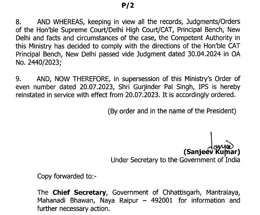 1994 बैच के छत्तीसगढ़ कैडर के अधिकारी गुरजिंदर पाल सिंह (GP सिंह) को 20 जुलाई 2023 को गृह मंत्रालय के आदेश पर सेवानिवृत्त कर दिया गया था, जिस पर उन्होंने CAT में चुनौती दी थी। ये रिटायरमेंट प्रदेश में तब की कांग्रेस सरकार की रिपोर्ट के आधार पर हुआ था।