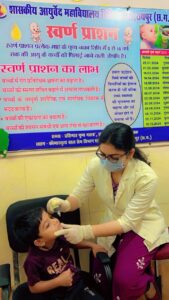 रायपुर:बच्चों के व्याधिक्षमत्व,पाचन शक्ति,स्मरण शक्ति,शारीरिक शक्ति वर्धन एवं रोगों से बचाव के लिए शासकीय आयुर्वेद महाविद्यालय चिकित्सालय रायपुर में मंगलवार को 1720 बच्चों को स्वर्णप्राशन कराया गया।आयुर्वेद महाविद्यालय चिकित्सालय के कौमारभृत्य विभाग द्वारा हर पुष्य नक्षत्र तिथि में शून्य से 16 वर्ष के बच्चों को स्वर्णप्राशन कराया जाता है।स्वर्णप्राशन के साथ ही शिशु रोग विशेषज्ञ डॉ.लवकेश चन्द्रवंशी ने बच्चों के स्वास्थ्य का परीक्षण भी किया।