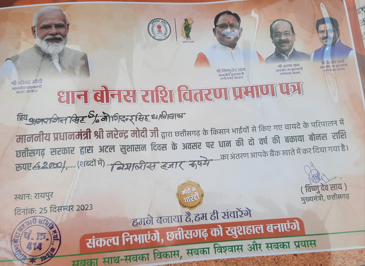 छत्तीसगढ़ के किसानों से हमने वादा किया था कि छत्तीसगढ़ में सरकार बनते ही 2 साल का बकाया बोनस हम किसानों को देंगे। यह बताने में आज मुझे बहुत खुशी हो रही है मुख्यमंत्री विष्णु देव साय ने छत्तीसगढ़ के 12 लाख से ज्यादा किसानों को 37 सौ 16 करोड़ रुपए ट्रांसफर कर दिया है।