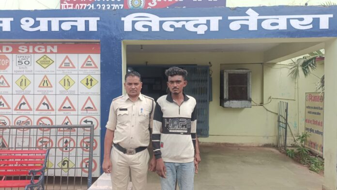 तिल्दा नेवरा: तिल्दा नेवरा पुलिस ने एक युवक को गिरफ्तार किया है, जो धारदार चाकू लहराकर लोगों को डरा-धमका रहा था। आरोपी के खिलाफ आर्म्स एक्ट के तहत मामला दर्ज किया गया है।पुलिस ने बतया की मुखबिर से सूचना मिली कि , एक व्यक्ति तिल्दा रेल्वे पानी टंकी के पास मेन रोड में एक धारदार हथियार चाकू लेकर लहराते हुये आने जाने वाले आम लोगो को डरा धमका कर भयभीत कर रहा है..सूचना मिलते ही पुलिस टीम तत्काल मौके पर पहुंची, देखा कि एक युवक अपने हाथ में धारदार हथियार चाकू लेकर लहराते हुये आने जाने वाले लोगो को डराते धमका रहा था