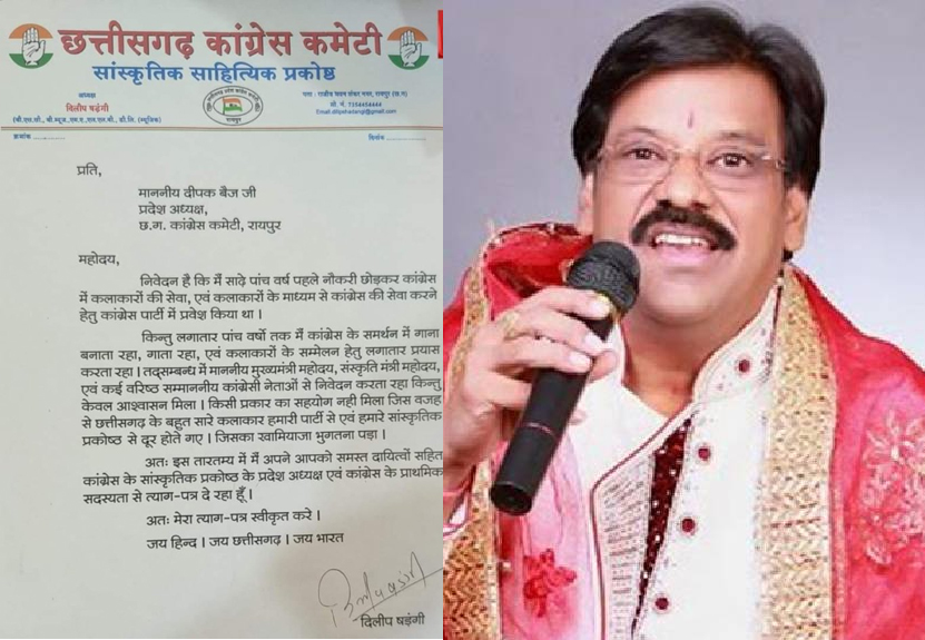 रायपुर। हार के बाद पार्टी छोडऩे का भी सिलसिला शुरू हो गया है कांग्रेस के सांस्कृतिक प्रकोष्ठ के प्रदेश अध्यक्ष दिलीप षडंगी ने इस्तीफा दे दिया है। प्रदेश अध्यक्ष को लिखे पत्र में उन्होने कहा है। मैं साढ़े पांच वर्ष पहले नौकरी छोड़कर कांग्रेस में कलाकारों की सेवा, एवं कलाकारों के माध्यम से कांग्रेस की सेवा करने हेतु कांग्रेस पार्टी में प्रवेश किया था।