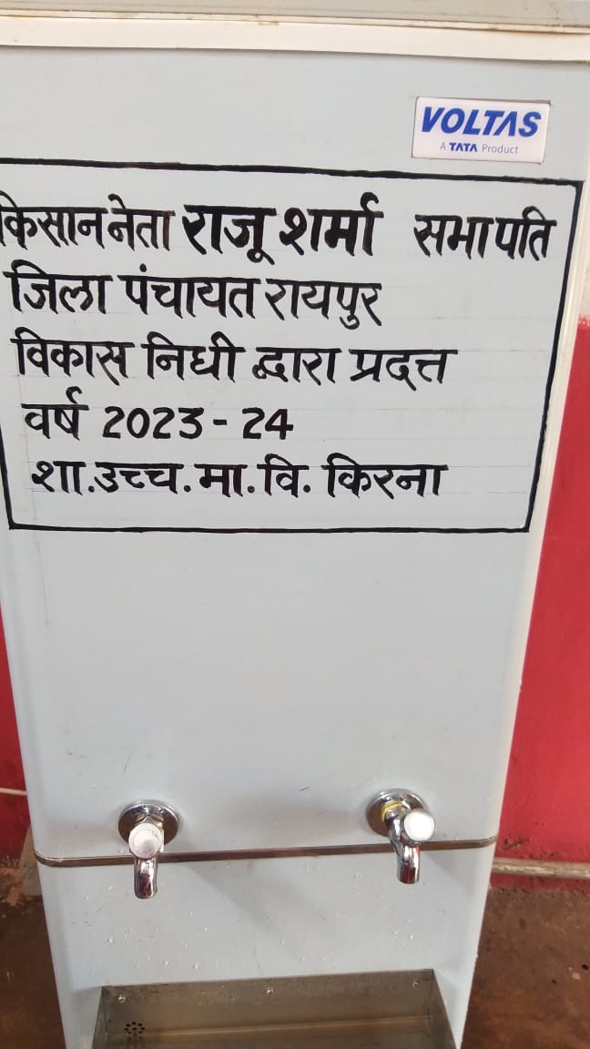 तिल्दा नेवरा-शहर से लगे ग्राम किरना शासकीय उच्चतर विद्यालय में जिला पंचायत सभापति राजू शर्मा ने  जिला पंचायत विकास निधि से 48 हजार रूपए की लगत का  RO शुद्ध वाटर कुलर लगाकर 15 अगस्त को उद्घाटन किया.