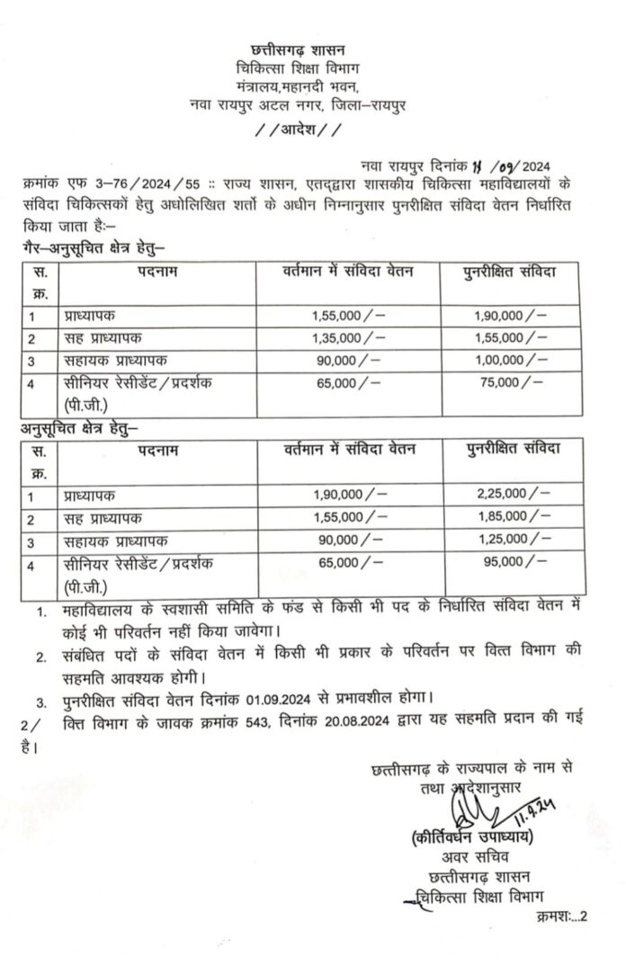 शासकीय चिकित्सा महाविद्यालयों के सीनियर रेसीडेंट से लेकर प्राध्यापकों के वेतन में हुई ऐतिहासिक वृद्धि की गई है।प्राध्यापक को अब अनुसूचित क्षेत्र में 2 लाख 25 हजार तथा गैर अनुसूचित क्षेत्र में मिलेगा 1 लाख 90 हजार रूपए वेतन। अनुसूचित क्षेत्र में लगभग 46 फीसदी तथा गैर अनुसूचित क्षेत्र में लगभग 23 फीसदी की वेतन वृद्धि की गई है।
