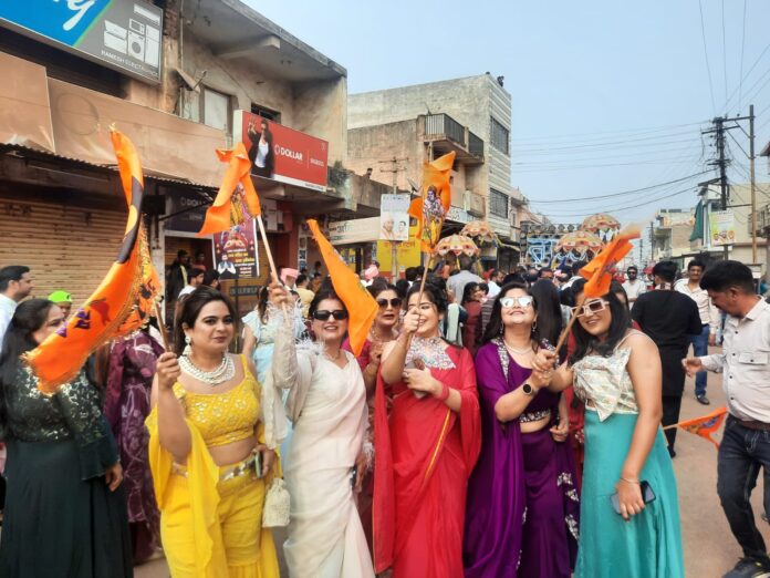 राम के रंग में इस कदर शहर रंग चुका है कि बच्चे से लेकर महिलाएं भी झंडा लेकर जय श्री राम के नारे लगा रही है , शहर में बचवानी परिवार की शादी में महिलाओं ने झंडा लेकर जय श्री राम के भजनों पर खूब ठुमके लगाए, इतना ही नहीं बारात में दूल्हा भी झंडालिए हुआ था ,,