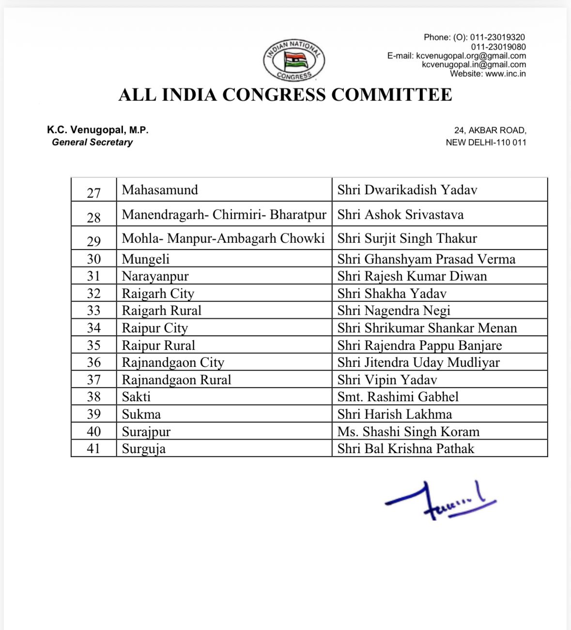 छत्तीसगढ़ कांग्रेस ने 41 जिलाध्यक्षों की लिस्ट जारी की:रायपुर से श्रीकुमार मेनन,ग्रामीण से पप्पु बंजारे को जिम्मेदारी, लखमा के बेटे को सुकमा की कमान