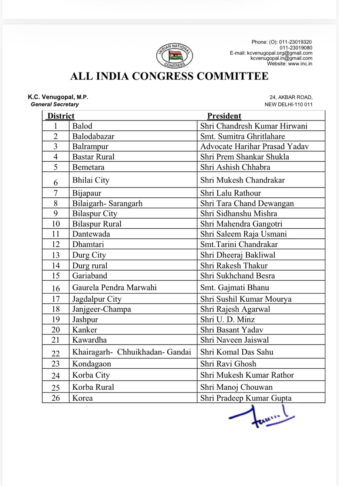 बालोद में चंद्रेश कुमार हिरवानी, बलौदाबाजार में सुमित्रा घृतलहरे, बलरामपुर में हरिहर प्रसाद यादव और बस्तर ग्रामीण के लिए प्रेम शंकर शुक्ला को जिलाध्यक्ष नियुक्त किया गया है। दंतेवाड़ा में सलीम राजा उस्मान, धमतरी में तारिणी चंद्राकर, दुर्ग शहर में धीरज बाकलीवाल, कोंडागांव में रवि घोष और कोरबा शहर में मुकेश कुमार राठौर को जिम्मेदारी मिली है।
