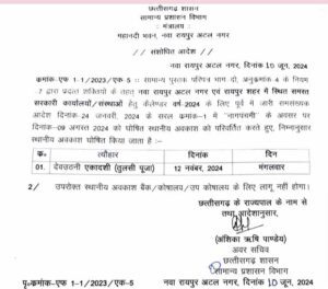 राज्य शासन द्वारा जारी आदेश के मुताबिक सामान्य पुस्तक परिपत्र भाग दो, अनुक्रमांक 4 के नियम -7 द्वारा प्रदत्त शक्तियों के तहत नवा रायपुर अटल नगर एवं रायपुर शहर में स्थित समस्त सरकारी कार्यालयों/संस्थाओं हेतु कैलेण्डर वर्ष-2024 के लिए पूर्व में जारी समसंख्यक आदेश दिनांक 24 जनवरी, 2024 के सरल क्रमांक-1 में “नागपंचमी” के अवसर पर 09 अगस्त 2024 को घोषित स्थानीय अवकाश को परिवर्तित करते हुए देवउठनी एकादशी (तुलसी पूजा) 12 नवंबर, 2024 मंगलवार को स्थानीय अवकाश घोषित किया जाता है। उपरोक्त स्थानीय अवकाश बैंक/कोषालय/उप कोषालय के लिए लागू नहीं होगा।